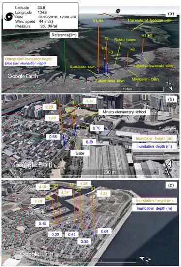 Survey locations; (a) Survey locations and measured inundation height (orange) and inundation depth (blue) along Osaka Bay, showing also the path of Typhoon Jebi (red line); (b) details of inundation height and inundation depth at Higashi-Kawasaki town; and (c) Suzukaze town. The measurement heights are exaggerated 2000:1 in (a) and 50:1 in (b,c).