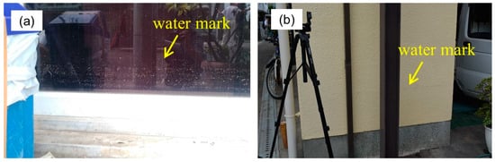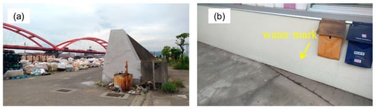 Photographs taken by the authors at Higashi-Kawasaki town. (a) Survey Point H2 (watermark on a window); (b) Survey Point H3 (watermark is indicated by a yellow allow).