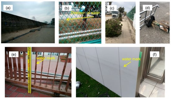 Three measurements were taken in this area: (1) the fence of an oil factory plant (F1); (2) the gate of a high school (F2); and (3) a model house in front of a department store (F3). The presence of debris at the fence of the oil factory plant, which were measured to be at a height of 1.27 m above the road, showed that the direction of water was towards inland (i.e., south to north; Figure 7b). Other debris, such as uprooted trees and road signs that drifted with the water flow, were observed around the area during the survey (Figure 7c,d), though they could also have been scattered due to the high wind. Significant inundation heights were also measured at a high school (Figure 7e) and a model house (Figure 7f), as shown in Table 2. Although it is still not clear whether the dike was overtopped by the storm surge or wind-driven waves, the observations indicate that the current level of coastal defenses could not completely protect this district from inundation.