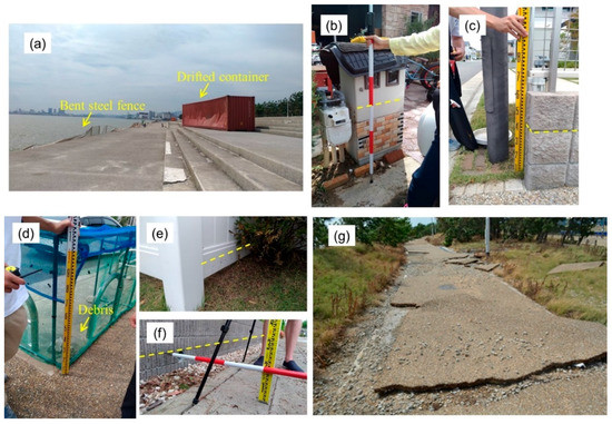 Photographs taken by the authors at Suzukaze town. (a) Damaged steel barrier and drifted shipment container at the embankment; (b–f) Survey Points S1–S5, respectively (watermark is highlighted with a yellow dashed line); (g) Eroded pedestrian road near the coastal embankment.