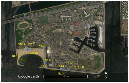 Bird’s eye view of the reclaimed land of Ashiya City and the location of the containers, whose coordinate are shown in Table 3.