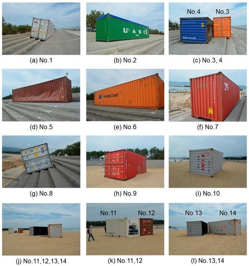 Many researchers have conducted hydraulic physical model tests and confirmed that the magnitude of a tsunami force would be significantly increased due to the presence of debris (in this sense, a weak tsunami force and a storm surge can be somewhat similar [34,35,36]). In addition, it takes considerable effort to collect all the drifted containers (in fact, Kobe city spent 10 day to collect all of them). Thus, it is necessary to give some further consideration on how to predict the location of drifted containers during a severe coastal flooding event. Some numerical simulation models to predict the movement of debris under tsunami flows have been proposed [37,38,39]. Although most of these types of models were validated by comparison with hydraulic physical model tests, a prolonged period of water surface elevation such as tsunami or a storm surge are difficult to accurately reproduce at the experimental scale. The movement of large vessels under strong tsunami flows were recorded during the 2011 Tohoku Earthquake and Tsunami, using Automatic Identification System (AIS) [40]. Naito et al. [30] investigated the positions of drifted containers by using satellite images taken at several areas affected by the 2011 event. However, to the authors’ knowledge, detailed information about the location of the actual containers displaced has never been provided. In that sense, the information provided in the present work should be useful to validate future simulation models of container displacement.