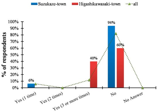 Proportion of respondents who have experienced some sort of damage from a previous storm surge (n = 5 for Higashi-Kawasaki town, n = 12 for Suzukaze town).