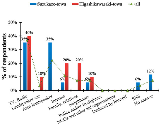 Regarding sources of information on the disaster, a relatively high percentage of people relied on TV or radio (Figure 13), which is similar to the tendencies observed in storm surges in other countries (e.g., Philippines for the case of Typhoon Haiyan [12]). This confirms that mass media is the most effective way to disseminate information [19]. However, as shown in Figure 14, 35% of respondents answered that this information was not very useful, which is opposite to what coastal residents reported in areas affected by Typhoon Haiyan in the Philippines [12]. This is probably due to the fact that no one had predicted that Suzukaze town could be flooded. Thirty-five percent of the respondents in Suzukaze town answered that they received information from the area’s loud speaker system. Ashiya City issued an evacuation order to local residents of Suzukaze town at 14:50 JST [20]. However, according to the locals, by the time this alert was issued, the area had already started to be flooded, and there was a power outage soon after the flooding started, meaning that they could not get any further information from TV. In addition, residents reported that they could not hear the evacuation order due to the strong sound of rain and wind. As a result, 58% of respondents in Suzukaze town answered that they did not get any information from local authorities.