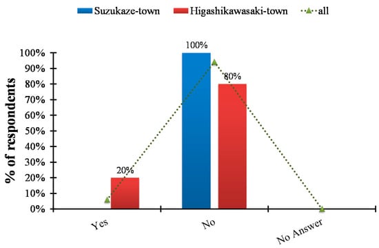 The first question of the survey asked respondents if they thought that the storm surge constituted a real danger for them. Figure 11 and subsequent figures show the disaggregated values for Higashi-Kawasaki town (n = 5) and Suzukaze town (n = 12). For the case of Higashi-Kawasaki town, 3 out of 5 respondents indicated that the storm surge constituted a real danger for them. People who thought that the storm surge was a real danger for them also answered that they had experienced damage during a previous storm surge (Figure 12) and that their place had been flooded during that event. In contrast, almost 60% of people in Suzukaze town thought that the storm surge did not represent a real danger for them. This relatively low awareness could be explained by the fact that 90% have never experienced flooding before (Figure 12). In addition, a storm surge hazard map provided by Hyogo Prefecture did not show that this area could be flooded [18]. Thus, it might have been difficult for people in this area to understand that they were in real danger.
