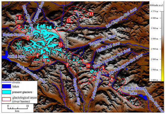 Glacial areas (river basins) of Tavan Bogd. 1—Kalguty, 2—Ak-Alaha, 3—Sangadyr, 4—Budiuhanasıhe, 5—Postgiyn-Gol, 6—Arshan-Gol, 7—Mogotiyn-Gol, 8—Ikh-Hatugiyn-Gol, 9—Baga-Hatugiyn, 10—Nalia-Gol, 11—Tsagan-Gol, 12—Ikh-Oigoryn-Gol, 13—Shepk-Oygoryn-Gol.
