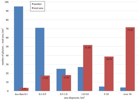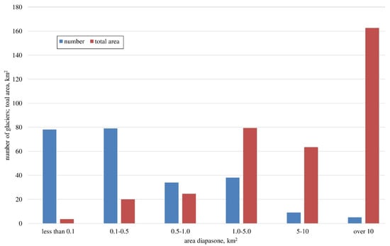 The distribution of the number of glaciers between the different area intervals has a clearly pronounced maximum in the range of less than 0.1 km2, and a secondary maximum in the range of 1.0–5.0 km2 (Figure 4). For the area, the contribution of the largest glaciers (more than 10 km2) and glaciers in the 1–5 km2 area range is the most important. Obviously, it can be said that the largest compound valley glaciers (i.e., Potanin, Kanas) play the main role in the glacial structure of the massif, as well as the more numerous small (mainly simple) valley glaciers.