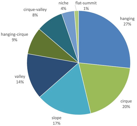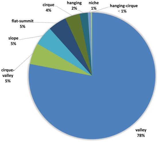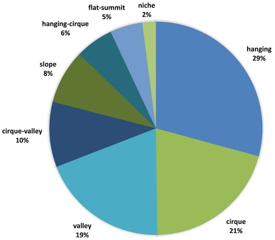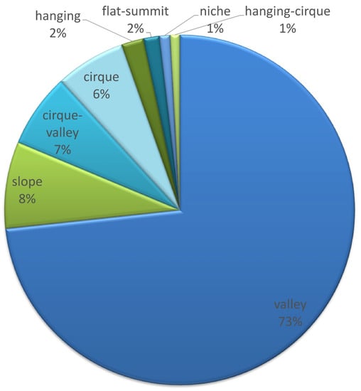 The morphology of the glaciers in the LIA maximum did not differ much from the current morphology. Valley and flat top glaciers constituted a somewhat larger proportion of the total quantity and total area of the glaciers (5% difference for the valley glaciers, for both quantity and area), which reflects the greater development of large glacial forms (Figure 10 and Figure 11). After the LIA, some valley glaciers divided into smaller glaciers of other morphological types or simply transformed into cirque-valley glaciers.