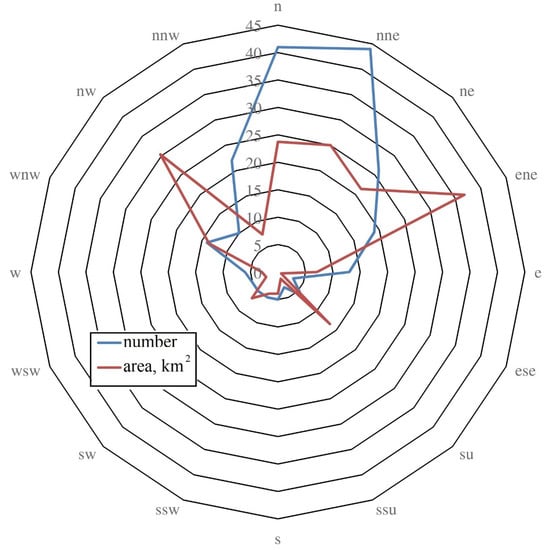 The aspect distribution of the number of glaciers (Figure 7) is quite typical for the study region: glaciers on the northeastern and northern slopes prevail. This position of the glaciers is most favorable due both to reduced insolation on shaded slopes, and because of the accumulation of snow that is swept to the leeward slopes by the prevailing south-western winds.