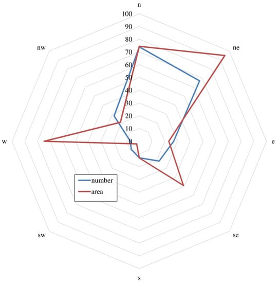 The aspect distribution of the number and area of glaciers at the peak of the LIA.