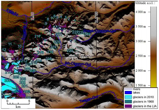According to our studies, in 2010 there were 225 glaciers with a total area of about 201 km2 (Table 2, Figure 3). The lowest point of elevation was 2496 m, and the highest was 4374 m (Khuiten Uul peak). The weighted average ELA was 3285 m.