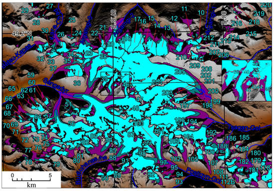 In recent years, significant progress has been made in the study of the glaciers of Tavan Bogd due to the use of remote methods [51,52]. Notably, this work includes compilation of the “Second Chinese Glacier Inventory” [53], in which the area of the glaciers in the Chinese portion of the massif was estimated to be 76 km2. The Global Land Ice Measurements from Space (GLIMS) database and the Randolph Glacier Inventory estimates the total area of the glaciers of the massif to be 204 km2 [54], and the area of the Mongolian glaciers to be 95.2 km2 [52] and 99 km2 [50], respectively.
