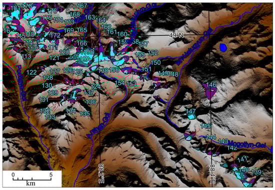 However, in the higher part of Tavan Bogd (Figure 13), in the upper reaches of Agramgi-2 and Argamgi-3, the disappearance of the glaciers was not typical due to larger glaciers. Degradation of the glaciers here mostly happened in the form of retreat of the snouts of valley glaciers (Figure 13, No. 20, 23) or complete disappearance of the snouts, resulting in disintegration of the valley glaciers or their transformation to other morphological types (Figure 13, No. 12, 14–16).