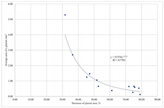 The distribution of glaciers in size at the peak of the LIA, despite the much larger average size (1.45 km2 compared to 0.89 km2 in 2010) had a character similar to that of the modern distribution (Figure 8). Quantitatively, small glaciers predominated, although the maximum of their occurrence was shifted to a range of 0.1–0.5, i.e., there was a much smaller proportion of glaciers on the verge of extinction. In terms of area, as in 2010, there were two maxima in the area intervals from 1–5 km and >10 km, although the dominance of the largest glaciers was more pronounced.