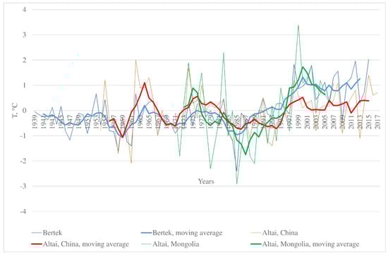 According to the information obtained for the two largest glaciers of the northern slope of Tavan Bogd (Table 5), they behaved synchronously. The periods of rapid retreat happened around 1968 and after 2009, while slow retreat took place in the 1990s. The recent fast degradation of the glaciers has been attributed to a delayed response to the period of rapid increase of temperature in the 1990s [73].