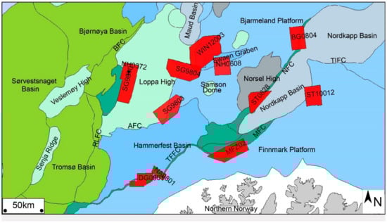 The fault data used in this study were extracted from 3D seismic cubes in the Norwegian Barents Sea. The locations of the seismic surveys are shown in Figure 1. Coherence volumes were calculated from the seismic cubes using a structurally oriented semblance-based coherence algorithm (Figure 2), where coherence is computed along the local orientation of the seismic reflector [14,17]. We have mostly selected single and isolated faults in each seismic cube, however in some cases, there are neighboring faults that approach or link to the studied faults.