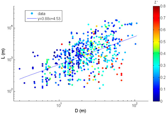 We first analyze the dependency of fault segment length on maximum displacement by using the multiple linear regression defined by Equation (1). In Figure 3 we present the studied data and optimal statistical approximation for k = 1 which corresponds to the maximal BIC and AIC value. The optimal values of k obtained by applying the BIC and AIC analysis are presented in Table 2. To show the dependence on the depth, the data points are colored according to the normalized depth of the measurement point Z′: