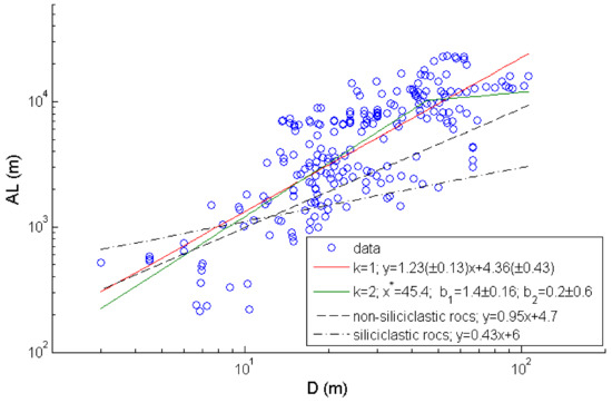 The BIC indicates that in all considered cases the best statistical approximations are also linear regression with k = 1 (dashed and dash-dotted lines in Figure 4). It is necessary to note that despite a smaller interval of D values the statistical parameters of these curves are very close to the corresponding parameters found in [7]. On the other hand, for both considered lithologies, the line slopes differ from b1 found in this study (solid line in Figure 4). This difference is more significant for siliciclastic rocks.