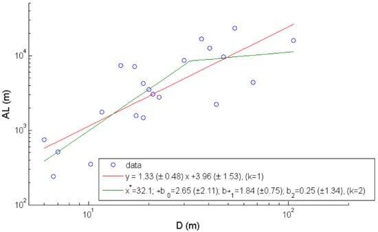 The research presented in the previous section requires full information about the distribution of lengths of fault segments at each depth (Figure 2b). In this sub-section, we study the relation between accumulated fault length and maximum displacement. The results of the BIC analysis show that optimal statistical approximation is achieved for k = 2, while the AIC shows that the optimal value of k equals 1 (Table 2). The analyzed data extracted from seismic data for 21 studied faults and the preferred fit for k = 1 (one slop model) and k = 2 (solid lines) are illustrated in Figure 4. Obtained regressions are