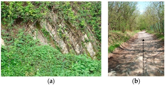 The site chosen for this study is located in the northern section of the valley, where significant outcrops are visible, as illustratively shown in Figure 1a. From a geological point of view, the area features Flysch facies, called Flysch di Bergamo, which consist primarily of a sequence of shale, marl, and sandstone.