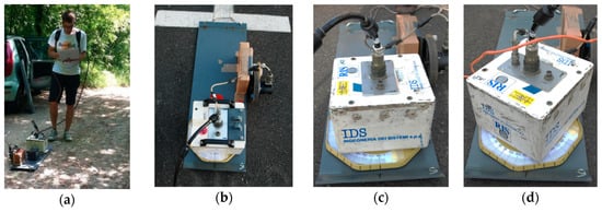 Acquisition campaign details: (a) Photograph of the survey process; (b) dedicated GPR platform, in which the mechanical protractor is visible below the antenna; and (c,d) examples of antenna rotation.