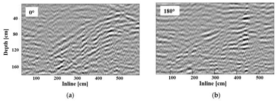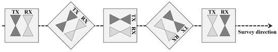 Along the same survey line, the GPR profiles were collected starting with the antenna oriented perpendicular to the inline direction, each time incrementing the rotation of the platform by 15 degrees, clockwise, until a complete rotation of the platform was obtained, i.e., inverting the location of the transmitter and the receiver. For a better understanding, a sketch is provided in Figure 3.