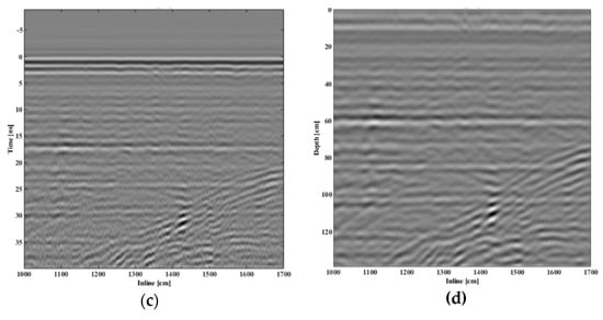 GPR data processing progression: (a) Time calibration; (b) frequency filtering; (c) amplitude equalization; and (d) time-to-depth conversion.