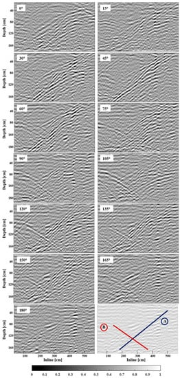 Collected GPR profiles are shown in Figure 6. Amplitude is displayed in grey colormap and was normalized in the range 0–1. For each frame, the angular deviation from the initial state is indicated. An outline of the targets of interest is provided in the lower corner of the panel.
