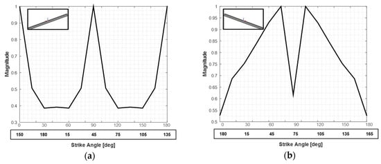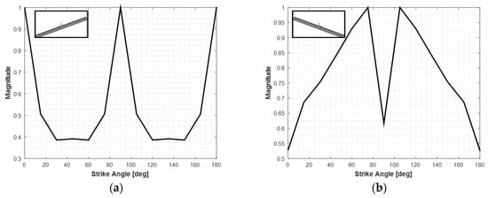In particular, for the fracture in Figure 10a, maximum responses were obtained when the azimuth plane was oriented parallel (0 and 180 degrees) and perpendicular (90 degrees) to the antenna direction, while the amplitude decreased down to less than half between them. Concerning the second target (Figure 10b), two optimal configurations were defined at an orientation of approximately 75 degrees and 105 degrees, and the magnitude of the response reached its minimum at 90 and 0/180 degrees.