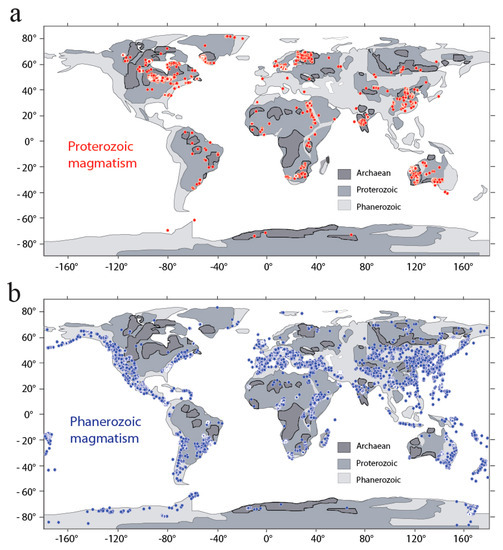 Distribution of Proterozoic (a) and Phanerozoic (b) magmatism on the Earth’s continental surface. The figure shows that Phanerozoic magmatism mostly occurs in lithosphere rimming Archaean and Proterozoic cratons and a concentric distribution of Proterozoic magma is also observed at the boundaries of Archaean nuclei, suggesting that most Precambrian lava considered in this study took place in arc settings.