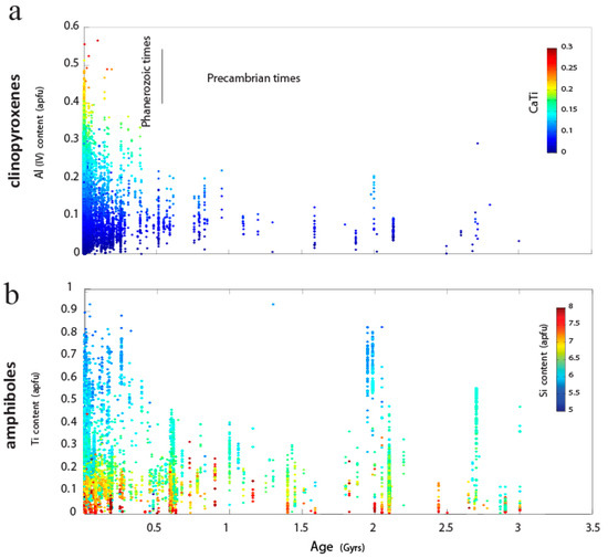 Statistical approaches were first applied to the large multidimensional clinoamphibole (amph) and clinopyroxene (cpx) database. Elaborative diagrams of the results are provided in Figure 3 and Figure 4c,d. They detail the chemical changes, linked to T stability ranges, of magmatic amph and cpx through geological times. The database demonstrates a progressive increase of Ti and Al content in the crystalline structures of magmatic amph and cpx during the Phanerozoic (Figure 3). The inversion of these chemical evolution trends to T crystallization conditions [38] reveals an increasing occurrence of high-T magmatic amph and cpx (Figure 4e) since ~0.6 Gyr, which contrasts with more monotonous crystallization conditions throughout the Precambrian.