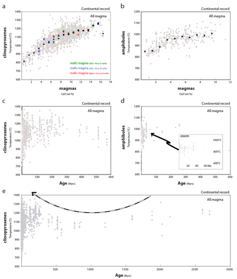 (a,b) Statistical assessment on the temperature conditions of amphibole (amph) and clinopyroxene (cpx) crystallization in magma (lava, continental s.l. record), using the min-Liq method [38], plotted against the composition of young Cenozoic magma (ca. 10–0 Myrs) hosting these minerals. Black and colored dots correspond to the bootstrapped values (1000 draws, threshold value of 3, uncertainty bars corresponding to ±1 σ standard deviation, chemical step of 1 unit). The black dots concern all magma in equilibrium with amph and cpx whereas the colored ones correspond to mafic magma, selected by ranges of composition in Si or Mg. It confirms that a positive correlation exists between Ca content of magma and temperature of crystallization for amph and cpx. Whatever the range of composition considered for mafic magma (Si43–51; Si45–55 or Mg06), the slope of correlation appear broadly similar. (c,d) T conditions of cpx and amph crystallization using the min-Liq method [38], plotted against the age of magma. The data illustrates an increase in low-T (T < 1000 °C) cpx and amph occurrence from ca. 0.3 Gyrs to present day [31], following a ~300 Myrs period dominated by the apparent absence of high-T cpx. Though, a temporal bias could exist in the Paleozoic times. Accordingly, an intriguing lack of mineral analysis is clearly observed in the Precambrian record (e), hampering the use of magmatic thermometers [38] to investigate the thermal evolution of mafic to felsic magma.