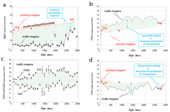 At the end of the Archean, we observe a slight increase in the Mg content of primary magmas (red points in Figure 6a), corrected from olivine fractionation (Mg decrease), followed by a decrease in Proterozoic times. This chemical evolution has been matched with the global record of mafic magmas (black points). The greatest divergence in Fe and Ca content between mafic and primary magmas occurs at the end of the Archaean, reaching its maximum in the Palaeo- and Mesoproterozoic times then progressively decreasing after ca. ~1 Gyr (Figure 6b,d).