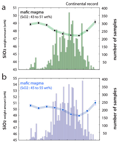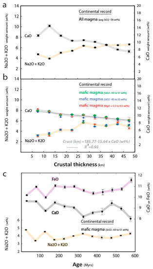 Because contrasting trends can reflect different tectono-magmatic systems, we have organized our data into three groups according to the inferred tectonic environment proposed by the authors of data referenced in GEOROC. These three groups are (1) continental margins, (2) intra-continental settings (CFBs, LIPs, rift-related magmatism and intraplate volcanism, including syn- to post-orogenic magmatism) and (3) oceanic domains. Lavas sampled in the actual oceanic domains have been discarded from our correlations, largely comprising MORBs or OIBs younger than 200 Ma. In the rest of the discussion, only magma (lava) sampled in arc or continental domains will be considered. Such magmas are grouped into the term “continental s.l.”, without further distinction (Figure 2). We acknowledge that major element contents of primary magmas are affected by melting conditions in the mantle and that hydrous lava from arcs may be not securely compared directly to intercontinental basalts. However, there are also some benefits in performing our calculations on a complete dataset of lava, even though they were sampled in different continental s.l. settings, to obtain qualitative or semi-quantitative information. We think the benefits of this approach exceed the intrinsic risk to which we are exposed in discarding or selecting inappropriate arc-type basalts in the Precambrian record, accounting for supposed discriminant ratio in trace elements [32]. There is also some evidence that both hydrous & anhydrous melting processes occur below continents and arcs, which are likely to generate variations in our range of mafic magma composition at any one time but will not affect the temporal trends of chemical values reported in Figure 3. Basically, if melting conditions in the Precambrian have been over- or underestimated, it is also the case for the Phanerozoic ones.