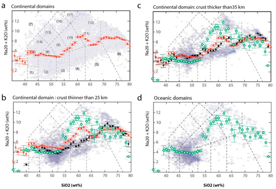 The chemical changes of magmatic samples from an oceanic spreading context (e.g., mid-ocean ridges) or in highly productive mantle upwelling context within oceans (e.g., some hotspots like Hawaii, La Réunion, Iceland, etc) are displayed in Figure 8d (green dots), with respect to those sampled in continental s.l. settings (Figure 8a; red dots). A significant increase of the alkali (e.g., Na + K) content of magma with increasing differentiation (e.g., Si increase) is observed in the oceanic record. Conversely, only a slight increase in the alkali content in magma is observed when the crustal thickness in the continental setting increases. Figure 8b,c yield correlations between the gradual increase or decrease of alkali magma occurrences in the continental record and the crustal thickness at the site of eruption (black dots). Bootstrapping of the total-alkali content reveals a negative correlation between Na + K and Si in the less evolved (basaltic) composition of magmas (Si45–52 wt%). The negative correlation is related to a more important increase of Si with respect to Na and K in thin crust, that persists over a large range of mafic magma compositions: Si43–51, Si45–55 or Mg06, Figure 9) but correlation becomes weaker with increasing crustal thickness. For comparison, the average trend of basaltic magma (black dots) emplaced in the continental crust has been reported on the diagrams (Figure 8b,c). It reveals a convergence of trends (black versus red dots) with increasing crustal thickness. These findings are consistent with those reported by Farmer & Lee [39], showing that the most silicic magmas (>70 wt.% SiO2) are paradoxically found in thin crust settings like the South Chile-Patagonia magmatic systems (Figure 10), where average compositions are low in silica (basaltic).