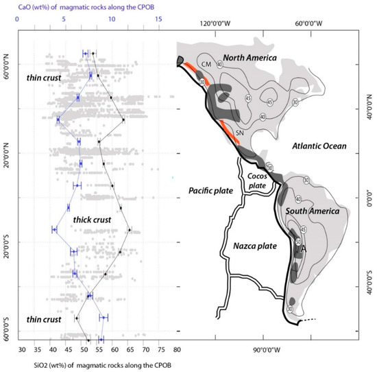 A test site was proposed by Turner et al. [25] for mafic magma emplaced in individual stratovolcanoes along the western coast of South America. It confirms that Ca correlates negatively with crustal thickness and similar results can be obtained using a different set of data from our database. Igneous samples considered in Figure 10 crop out along the western margin of North and South America, covering the compositional range of basalts to rhyolites (40–75 wt% SiO2). As illustrated by Figure 7a, the Ca content of magma increases with decreasing crustal thickness although there is no clear evidence of lithospheric increase along the strike of the belt [49,55].