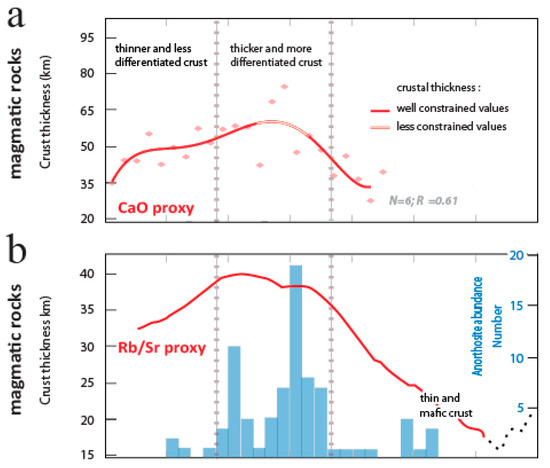 Our new proxy using Ca content (wt%) in mafic lava (Figure 12a) suggests that the Archaean crust (<35 km) thickened during the Proterozoic (>50 km) and thinned in the Phanerozoic, which is consistent with results of Dhuime et al. [18]. If correct, this change in global crustal thickness likely resulted from the interplay of several factors evolving throughout time and space, such as the secular cooling of mantle and its continental crust, as well as changes in geodynamic processes with the development of the plate tectonic regime we know today [30,42,58,59,60]. Such interplay potentially resulted in the formation of the first supercontinent (Columbia) on Earth, toward ca. 1.8 Gyrs (Figure 12c).