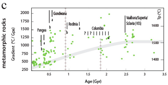 - Brown, M.D. Characteristic thermal regimes of plate tectonics and their metamorphic imprint throughout Earth history: When did Earth first adopt a plate tectonics mode of behavior? In When Did Plate Tectonics Begin on Planet Earth? Condie, K.C., Pease, V., Eds.; GSA Special Issue; Geological Society of America: Boulder, CO, USA, 2008; Volume 440, pp. 97–128. [Google Scholar]