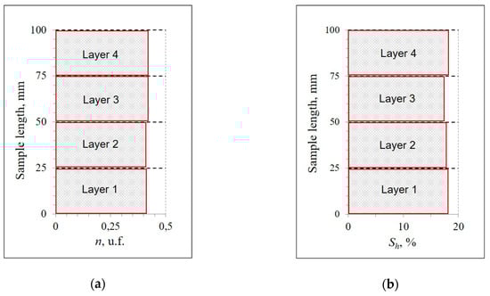 Porosity (n, u.f.) and methane hydrate saturation (Sh, %) over sample height (fine sand with 7% of montmorillonite clay particles, Win = 10%). (a) Porosity distribution; (b) hydrate saturation distribution.