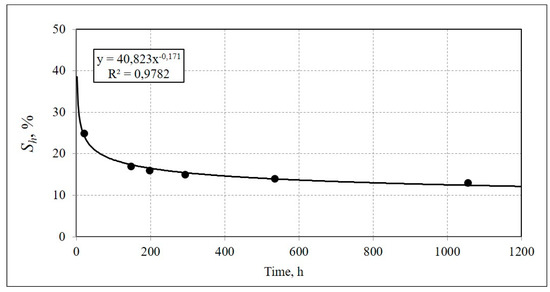 Time-dependent hydrate saturation (Sh) of frozen fine sand-1 at −6 °C and 0.1 MPa. Black dots are experimental data; solid line is a trend line of exponential approximation.