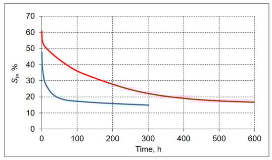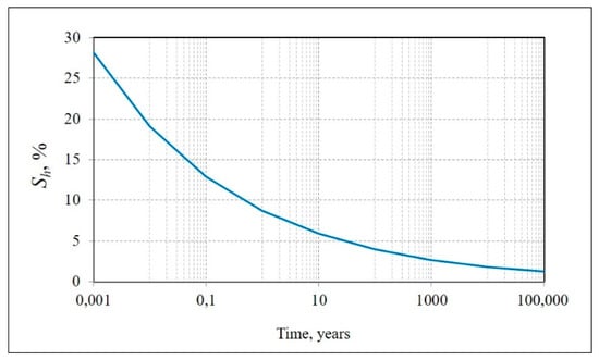 Predicted time-dependent decrease in hydrate saturation in frozen soil at T = −6 °C and P = 0.1 MPa.