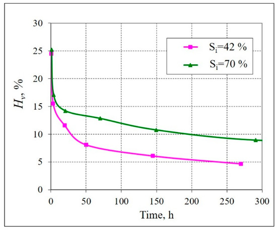 (1) Pressure in the cell with frozen hydrate-bearing soil samples dropped to 0.1 MPa. Then, the cell was opened, and the samples were taken out, most often 30 min after the pressure drop. The samples were then analyzed in terms of their physical properties: structure and texture, moisture content (W, %), porosity (n, u.f.), dry density (ρd, g/cm3), gas and hydrate contents, percentage of pore moisture converted to hydrate as well as ice and hydrate saturation [48]. The moisture content W is the weight ratio of water in soil (Mw) to dry soil (Msk) in percentage (%):