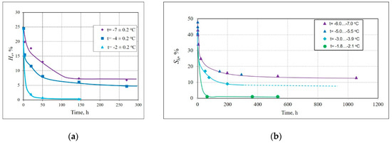 The self-preservation of pore hydrates in frozen rocks has multiple controls. This is primarily the initial content of pore moisture (water and ice) prior to pressure drop. The presence of pore ice originally decelerates the dissociation of pore hydrates and maintains their stability at below-equilibrium pressures. Frozen (−4 to −5 °C) hydrate-bearing samples with higher initial ice contents showed both faster decay of hydrate dissociation and higher residual hydrate saturation at the run end (Figure 7). Of the two methane hydrate samples with equal initial hydrate saturation of Sh ≈ 11%, the one with higher initial ice saturation (Si = 70% against Si = 42%) showed better preservation. Thus, ice-rich frozen rocks can be expected to store greater amounts of relict pore gas hydrates.