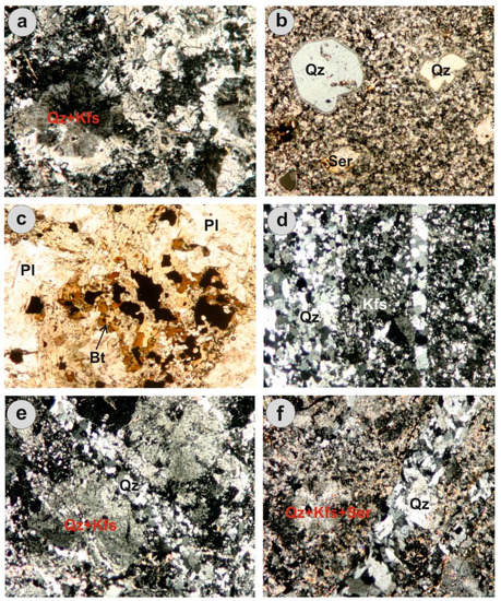 The Aisymi-Leptokarya felsic dike complex is texturally inhomogeneous and consists of at least two variants, both of which are hydrothermally altered: (a) a strongly silicified and sericitized equigranular to porphyritic variety, dominated by subhedral to anhedral quartz, K-feldspar (replaced by kaolinite) and sericite (pseudomorph after primary biotite) (Figure 4a). Spherulitic aggregates of quartz and K-feldspar are commonly present (Figure 4a), together with graphic textures of quartz and orthoclase; (b) a porphyritic variety, which includes quartz and K-feldspar phenocrysts embedded within a microcrystalline matrix of quartz and possible feldspars (Figure 4b). This variety resembles the acid dike rocks described by Alfieris et al. [26] and mostly occurs along the south-eastern margin of the Aisymi-Leptokarya felsic dike complex.