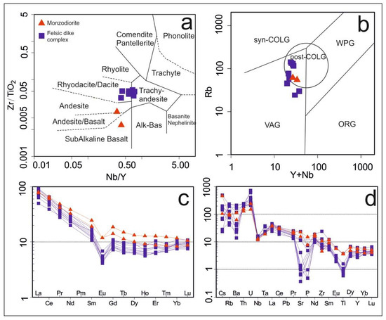 (a) Classification of the studied magmatic rocks based on the Zr/TiO2 versus Nb/Y diagram after Winchester and Floyd [29]; (b) Rb versus Y + Nb diagram after Pearce and Harris [30]. VAG, Volcano Arc Granite; Syn-COLG, Syn-collision Granite; WPG, Within-Plate Granite; ORG, Ocean Ridge Granite, post-COLG, Post-collision Granite. The field of post-collisional granite (Post-COLG) is from Pearce [31]; (c) chondrite-normalized rare earth elements after Boynton [32] and (d) primitive mantle trace elements- normalized patterns of the studied rocks after McDonough and Sun [33].