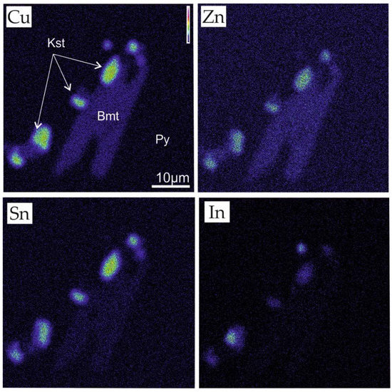 Kesterite revealed almost stoichiometric composition, with a minor substitution of Sn by In (values up to 0.70 wt.%) (Figure 8).