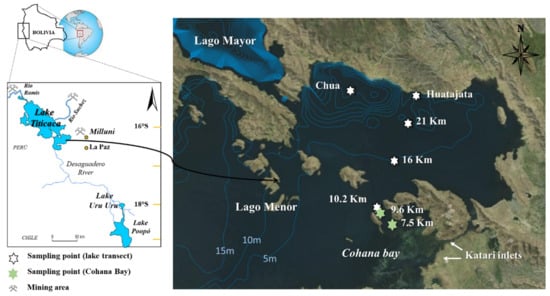 Due to its shallow water column, the entire water column of Lago Menor is mixed due to strong winds on a daily basis. The lake has a moderate salinity (0.810 ± 0.001) and is rich in sulfate (150–200 mg∙L−1, []) due to the geological context and mining activities of sulfide containing ores in the area. The pH is slightly alkaline (8.69 ± 0.02). Most littoral is dominated by macrophyte Totora (Schoenoplectus californicus), and the sediments of most of the shallow parts (<15 m) of the open lake were covered by the macroalgae Chara (Chara sp.). The main tributaries of Lago Menor are the Lago Mayor and the Katari River. The Katari River drain the densely populated area of El Alto city and discharges nutrients and contaminants into the Cohana Bay (Figure 1).