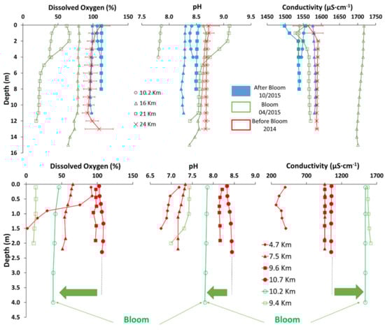 Oxygen, pH and conductivity profiles of the water column along open lake through the small basin of Lake Titicaca (upper panel) and along the Cohana Bay (lower panel) during the bloom (empty green symbols), few months after the bloom (full blue symbols), and a year before (empty red symbols). Distances are from the Katari River inlet to the lake. Error bars for 2015 data represent 20 to 40 measurements, while for 2014 data represent between 200 to 400 data collected through the 24 h period. Thick arrows highlight the shift in values between the bloom event and normal conditions.