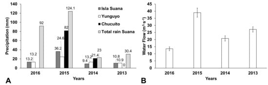 (A) Precipitation from maximum continuous rain events registered at three different locations around the Lago Menor (Figure S3) and total precipitation during April of different years. (B) Average water flows recorded at the Desaguadero River (all data collected from Senamhi Peru web page http://www.senamhi.gob.pe/).