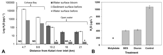 (A) Hydrogen sulfide concentrations in the water column along the transect from Katari river inlets in the sediment surface before the bloom and water surface before and after the bloom. Concentration in some locations was not determined (ND) or was below the detection limit (<1.9 µg∙L−1) (*). (B) Hydrogen sulfide concentrations in pore water after incubations in samples at 9.6 km from the Katari River inlet amended with molybdate, BES (methanogen inhibitor), Diuron (algae inhibitor) compared to a not amended control.